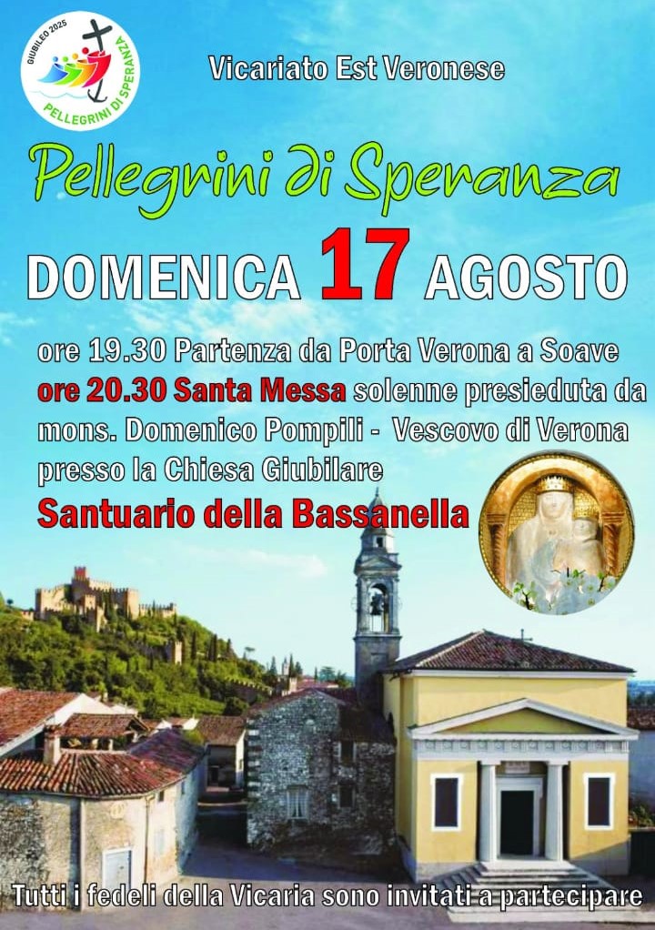 Domenica 17 agosto a Soave si terrà il pellegrinaggio giubilare del vicariato dell’Est veronese al santuario della Bassanella, guidato dal vescovo Domenico Pompili (con ritrovo alle 19.00 e partenza alle 19.30) e seguito dalla Messa presso la chiesa giubilare (ore 20.30)